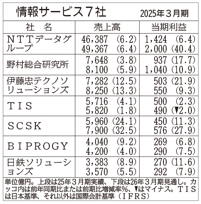 情報サービス7社の2026年3月期連結業績予想は全社が増収を見込む。米国の関税政策による影響を注視する一方で、デジタル変革(DX)の機運に伴う企業のIT投資意欲は底堅いと見る。各社は国内の同業他社へのM&A(合併・買収)を活発化するなど中長期的な成長戦略を描いており、業界内の事業規模の順位にも変動が生じる見込みだ。
