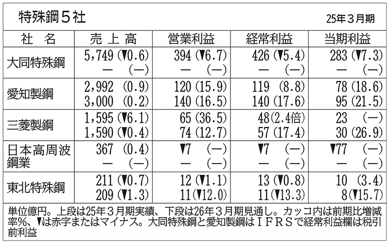 大同特殊鋼は関税政策や為替変動など不透明な要素が多いため業績予想は上期分のみ公表。25年4―9月期営業利益は前期比31・5%減の125億円と見込む。鋼材は日系メーカーの中国シェアが低下している自動車のほか、産業機械向けも需要が低調と想定。自由鍛造品は米ボーイングのストライキによる生産減などが押し下げ要因になる。下期分は算定可能な段階で公表する。