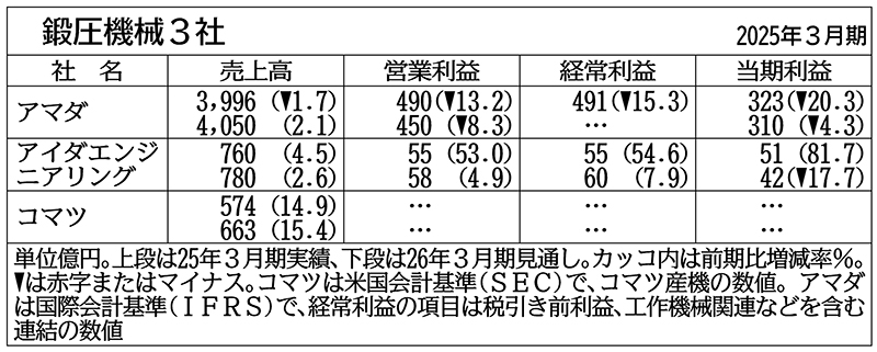 鍛圧機械3社は2026年3月期連結業績予想で全社が増収を見通す。豊富な受注残が下支えし、製造回帰が進む米国などで堅調な受注を見込む。一方、利益面では為替の円高が逆風となり、トランプ米政権の関税措置も一定程度利益を押し下げるとみる。ただ買収が業績を押し上げる見通しで、不透明な市況の中で成長を目指す。