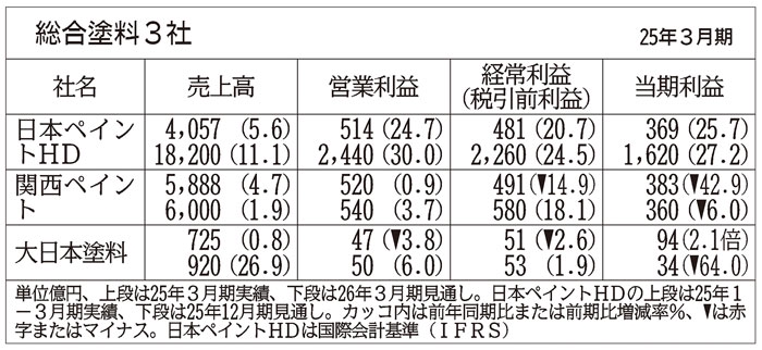 総合塗料3社の2026年3月期(日本ペイントホールディングス〈HD〉は25年12月期)連結業績予想は、全社が増収営業増益を見込む。工業用や建築用塗料などの需要は堅調で、M&A(合併・買収)した企業の連結効果が業績を押し上げる。日系自動車メーカーの生産台数減少の影響はしばらく続く想定だが、全体としては底堅く推移しそうだ。